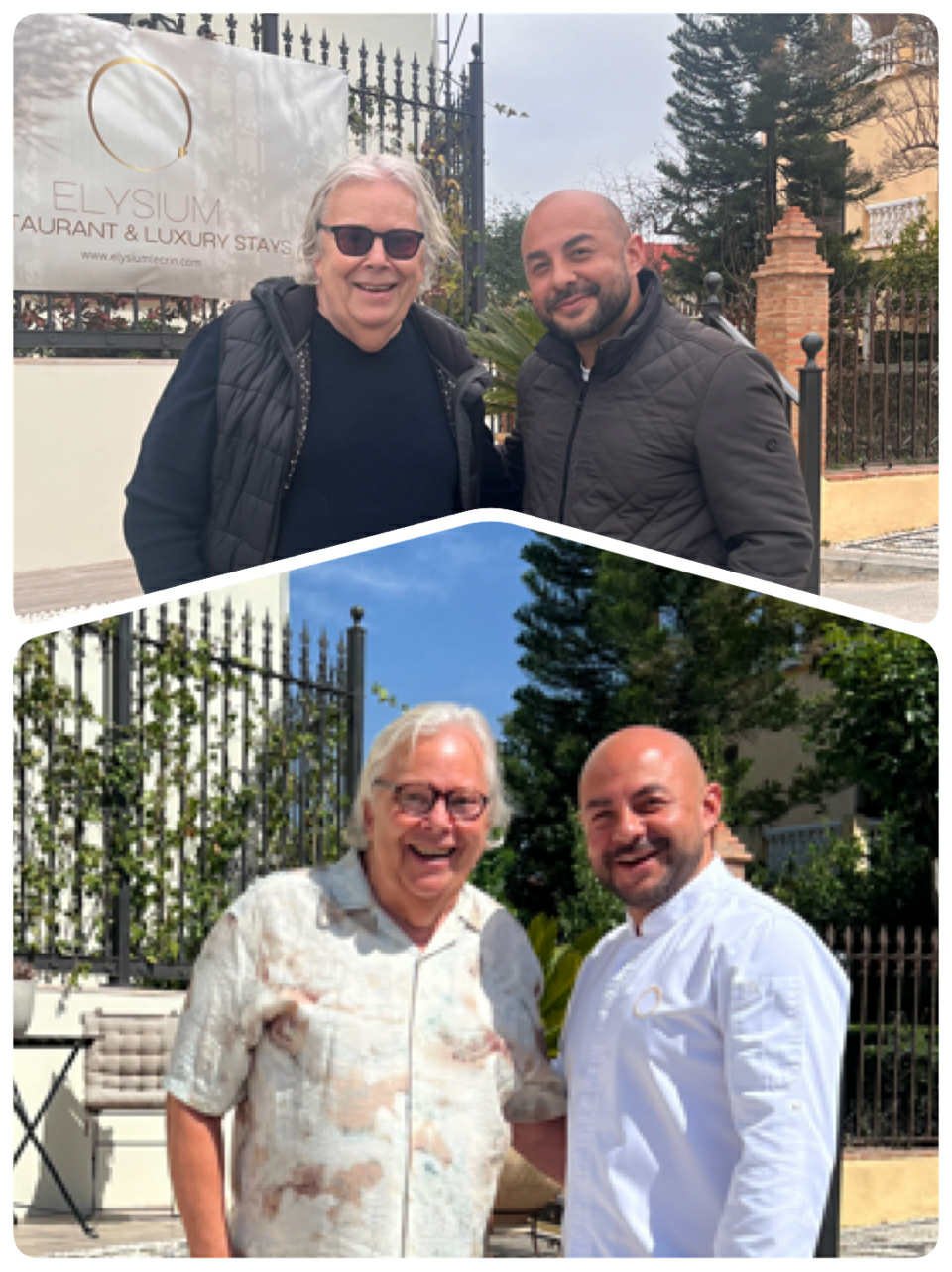 Michael Sandoval sammen med artikkelforfatteren i januar 2025 (øverst) og deretter sommeren 2025 når Elysium var åpnet for gjester. Foto: Privat