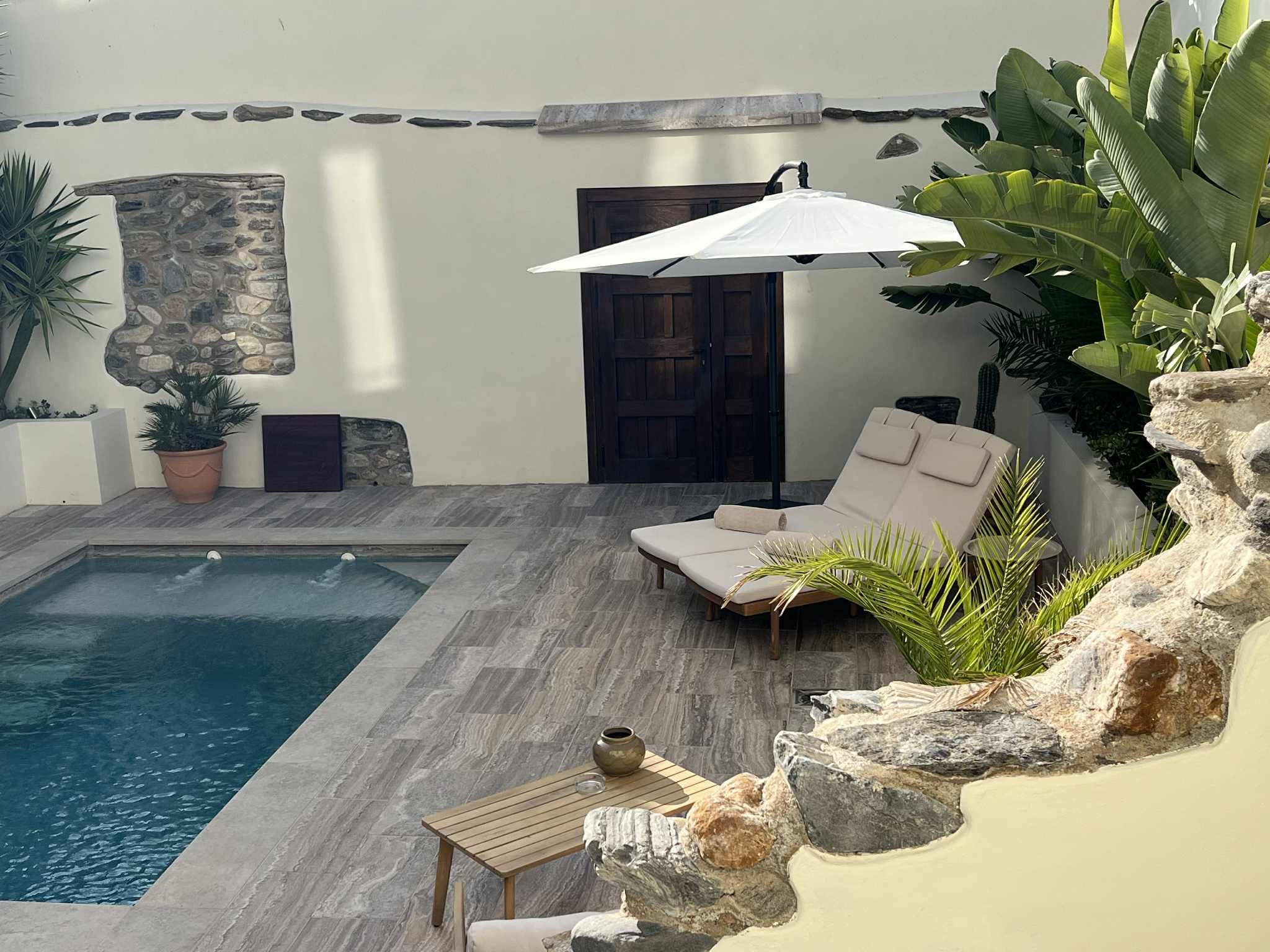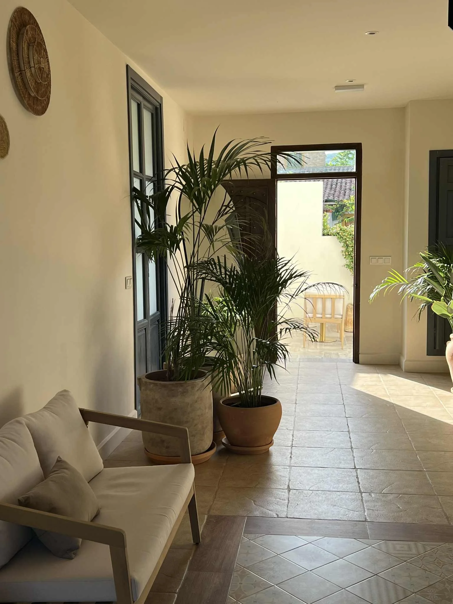 Jasmijn tar oss vel imot, og mens vi sjekker inn kommer Michael bærende på et brett med to glass avkjølt, nyskjenket cava. Mer skal ikke til før vi føler oss veldig velkommen. Vi får en suite i første etasje, tredelt, med stue og et lite kjøkken, stort bad og et luftig soverom med en bred dobbeltseng. Her skal vi nok trives!