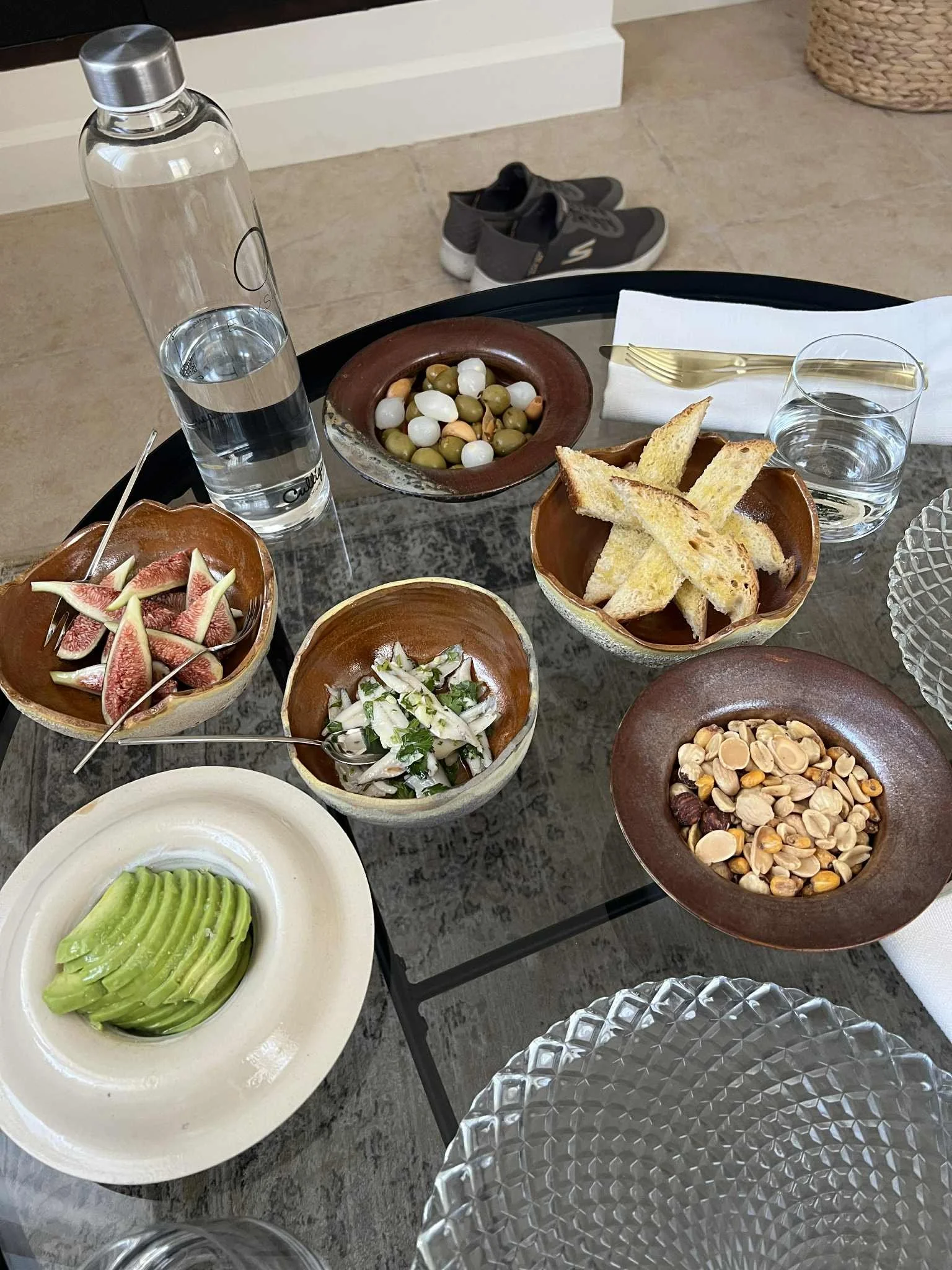 Ettersom det fortsatt er tidlig ettermiddag, spør vi om det er mulig med noe snacks på rommet. Og det er det naturligvis! Kort tid etter er seks skåler med gode munnfuller på plass. Sardiner renset og lagt i olje av en tidligere nonne som nå er nabo, lokalt dyrket fersk fiken og avokado, oliven, nøtter og hvitløksristet brød. Smakfullt!
