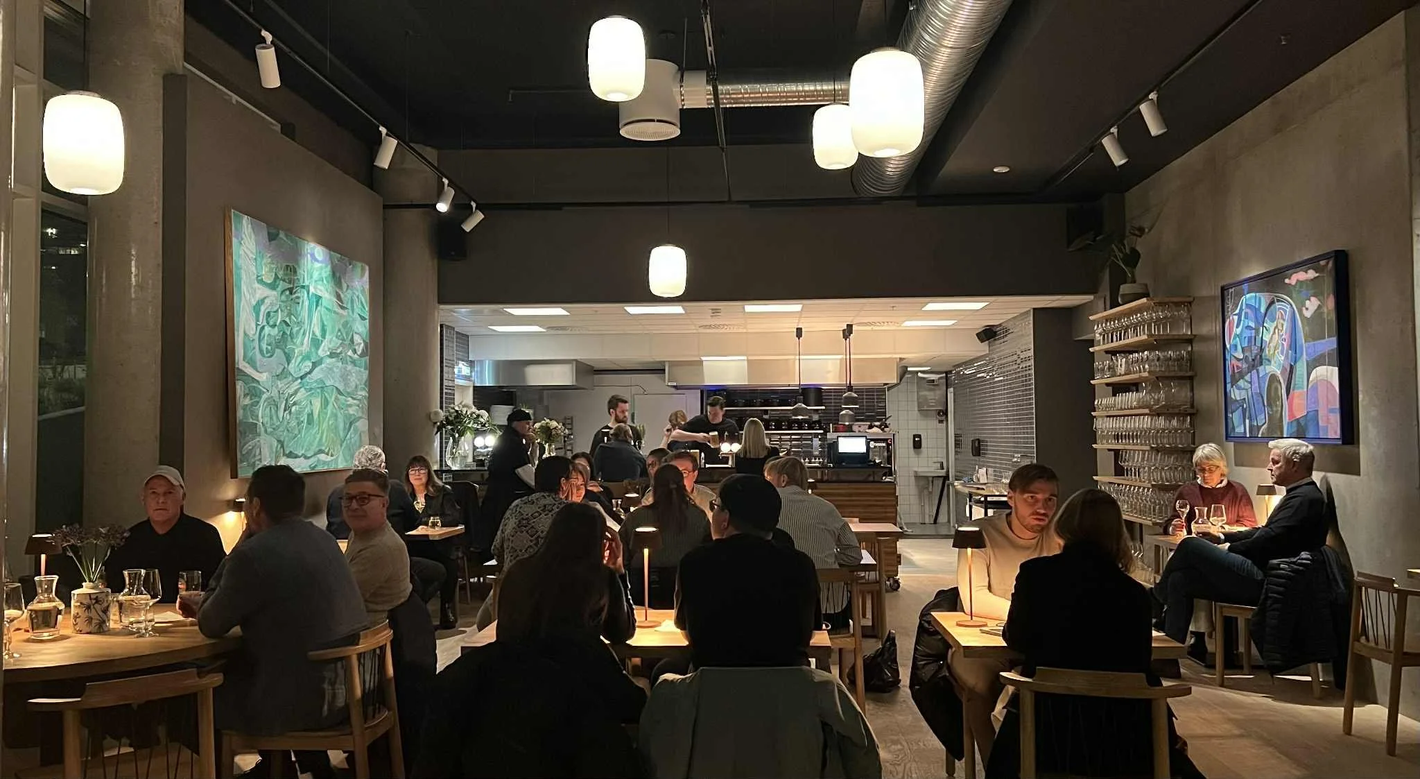 Hovedlokalet ved Nyhavna Bistrobar sett fra inngangen, med bardisk og åpent kjøkken helt innerst. I tillegg har de en koselig avdeling til høyre for inngangsdøra. Foto: VinPuls/Ulf Dalheim