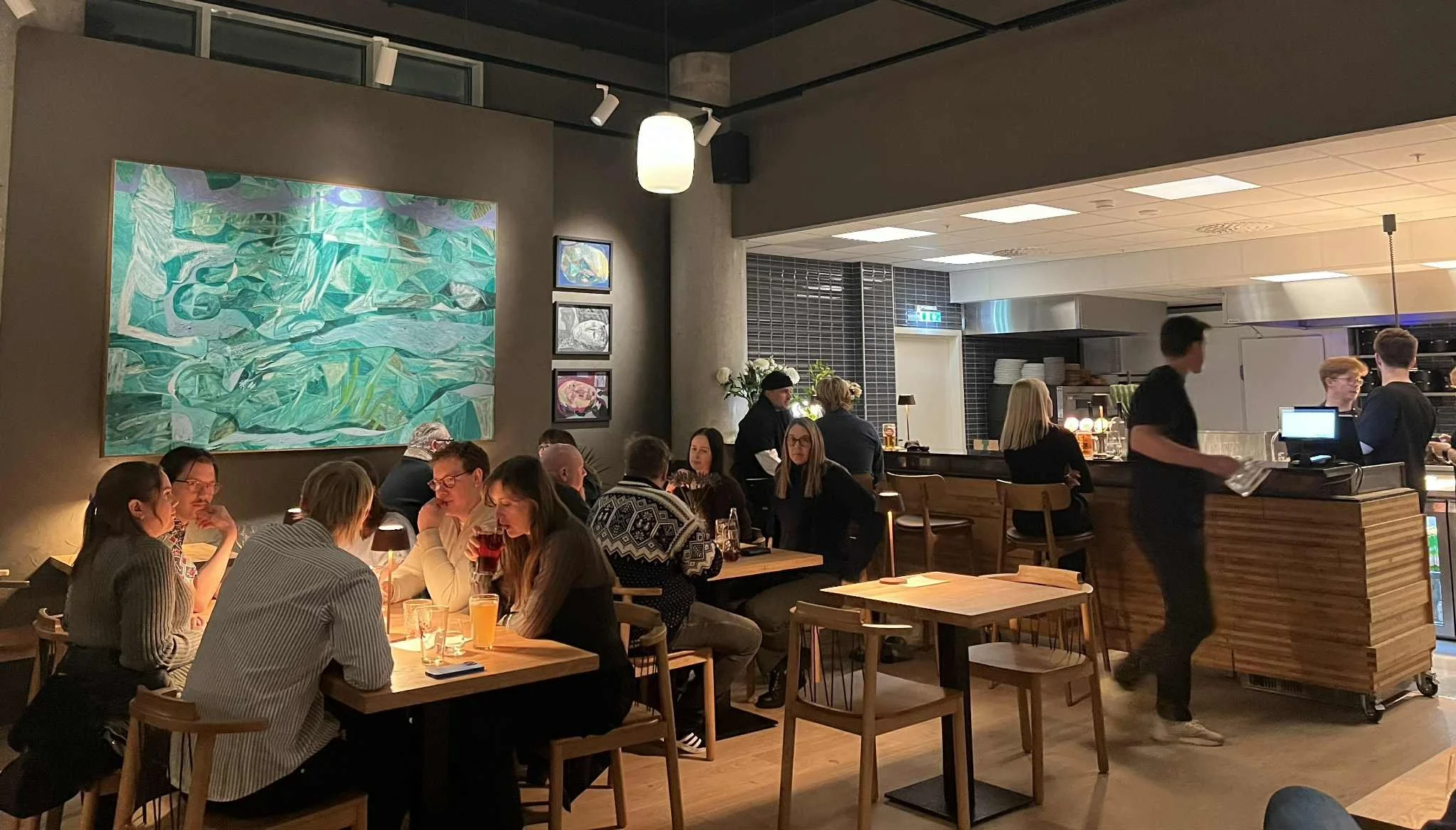 Skupturen (t.h.) er laget av trondheimskunstneren Sverre Bjertnæs og hans mor. Det samme er det store maleriet på veggen i denne delen av restaurantlokalet. Foto: VinPuls/Ulf Dalheim