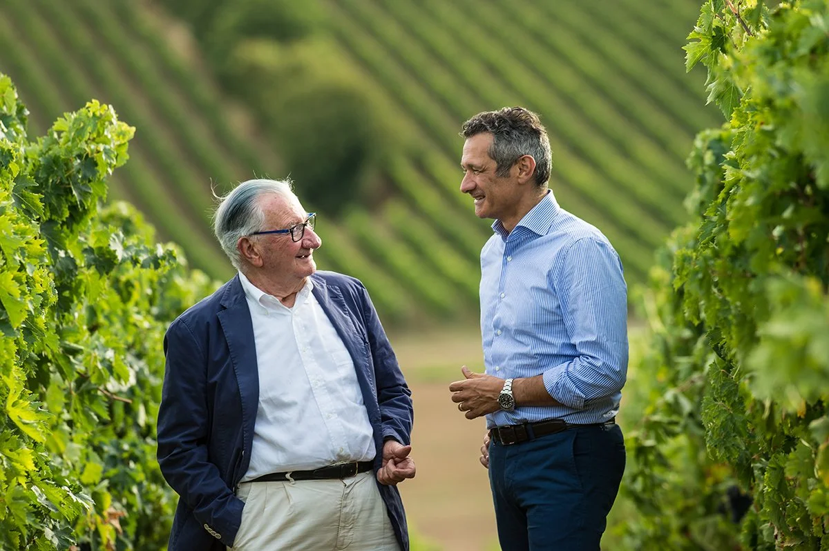 Massimo Bernetti (t.v.) fikk ansvaret for vinhuset Umani Ronchi da gründerne Gino Umani Ronchi og Roberto Bianchi trakk seg ut. Nå er det hans sønn Michele som fører arven videre. Foto: Umani Ronchi