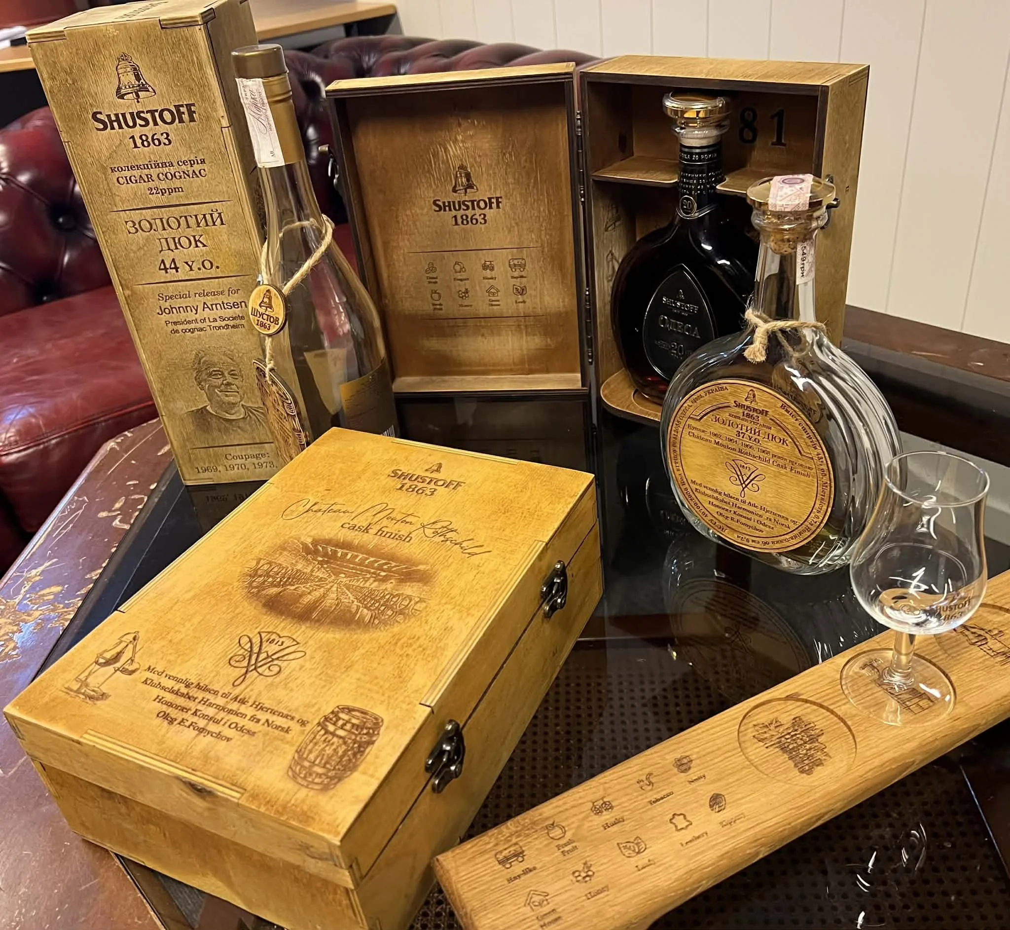 Forskjellige utgaver av Shustoff brandy som gjerne pakkes inn i forseggjorte trekasser med egne inskripsjoner. Kassen på bildet var en gave til Atle Hjertenæs og Klubselskabet Harmonien fra den norske honorære konsulen i Odessa. Foto: VinPuls/Ulf Dalheim