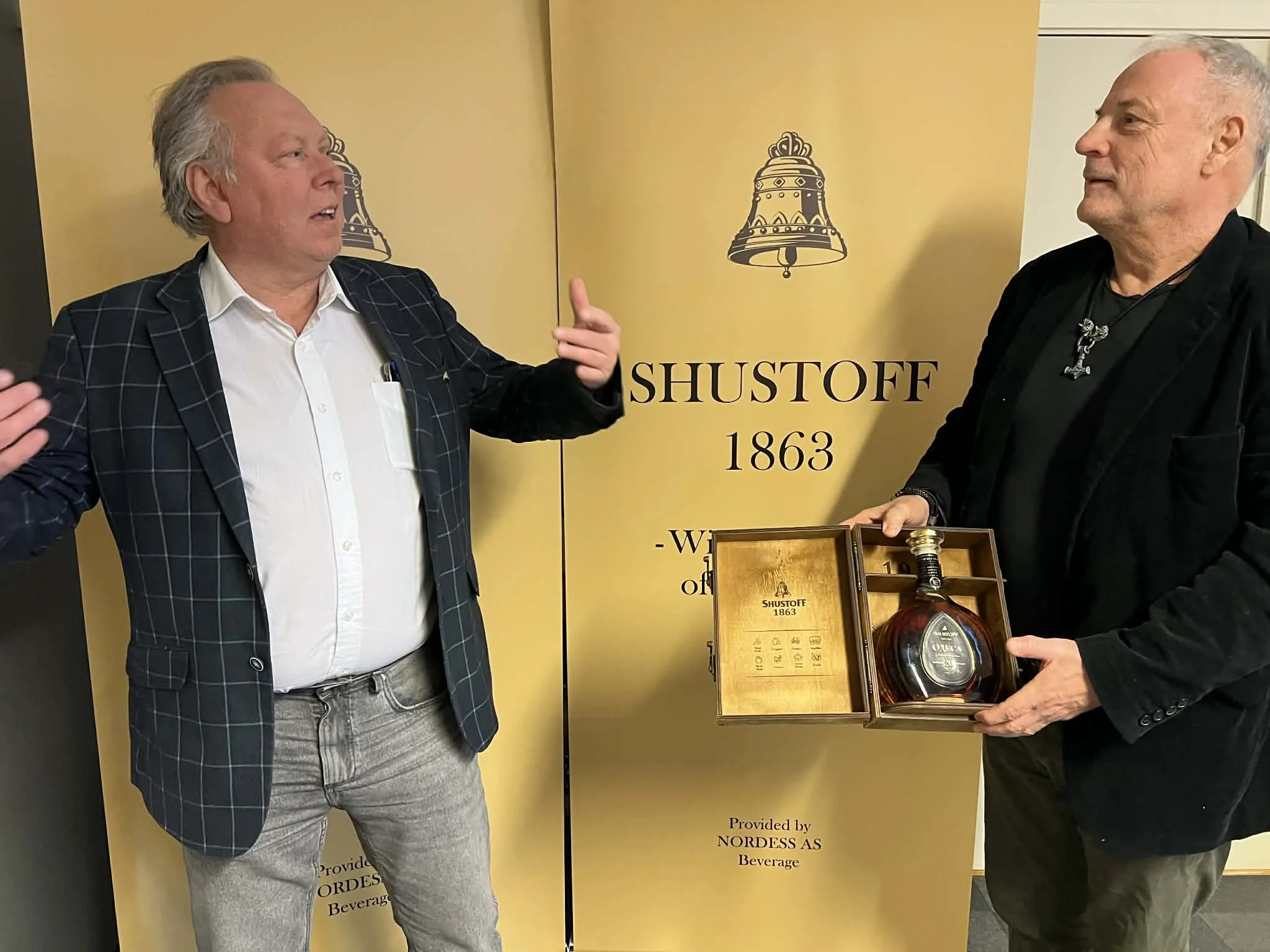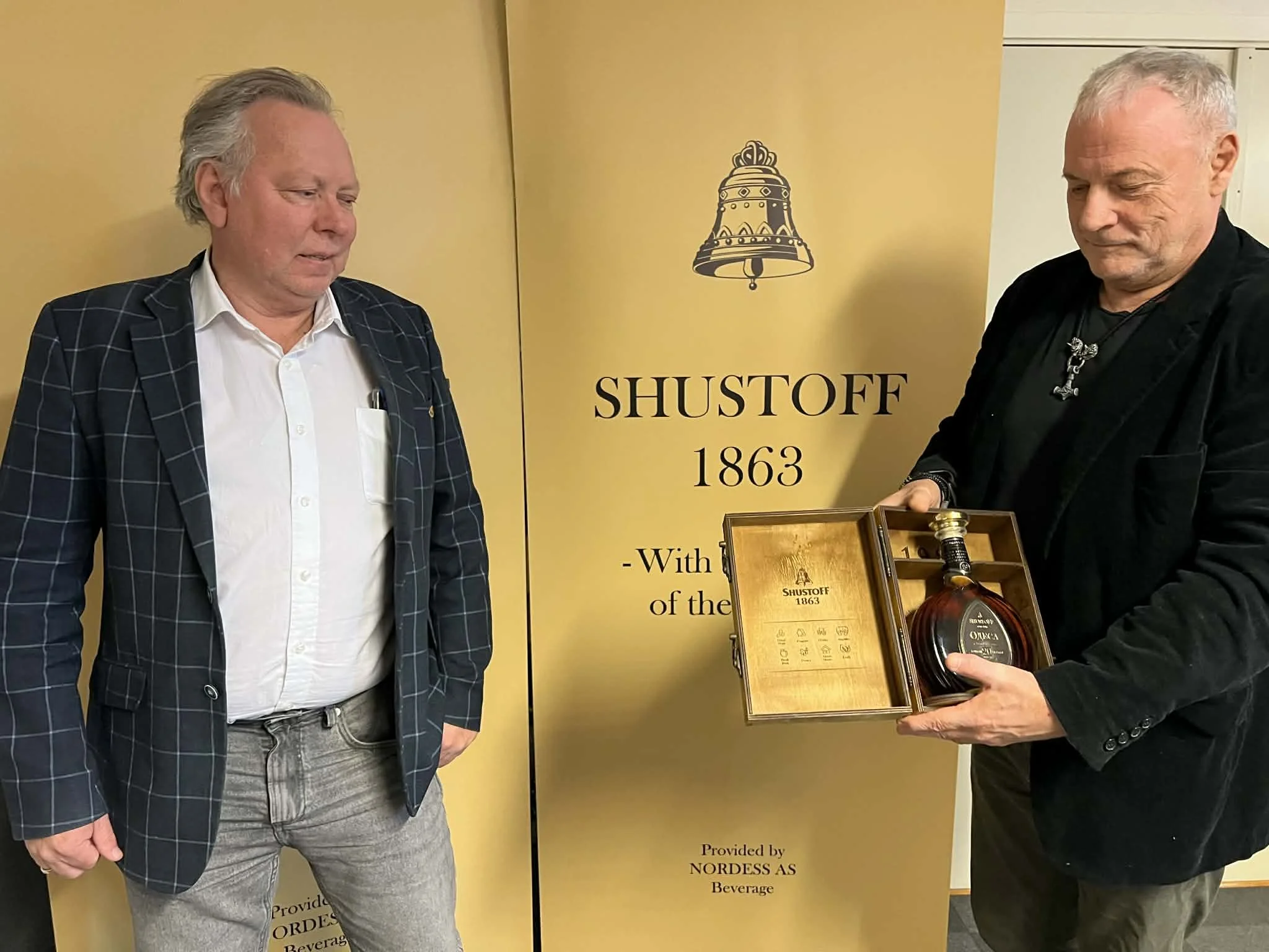 -Vi forsto etter smakingen i Harmonien at Shustoff har gode produkter, så vi har sørget for å sikre oss eksklusivitet for Skandinavia for produktene Shustoff lager. Etter å ha møtt folkene hos Shustoff, blant annet deres meget innovative markedsdirektør, har jeg stor tro på at de har produkter som kjennere her i Norge og Norden ellers vil like. Markedsdirektøren lager hvert år 15 flasker av en eksklusiv sigarkonjakk hvor første flaske alltid går til presidentene, sier Atle og Johnny.