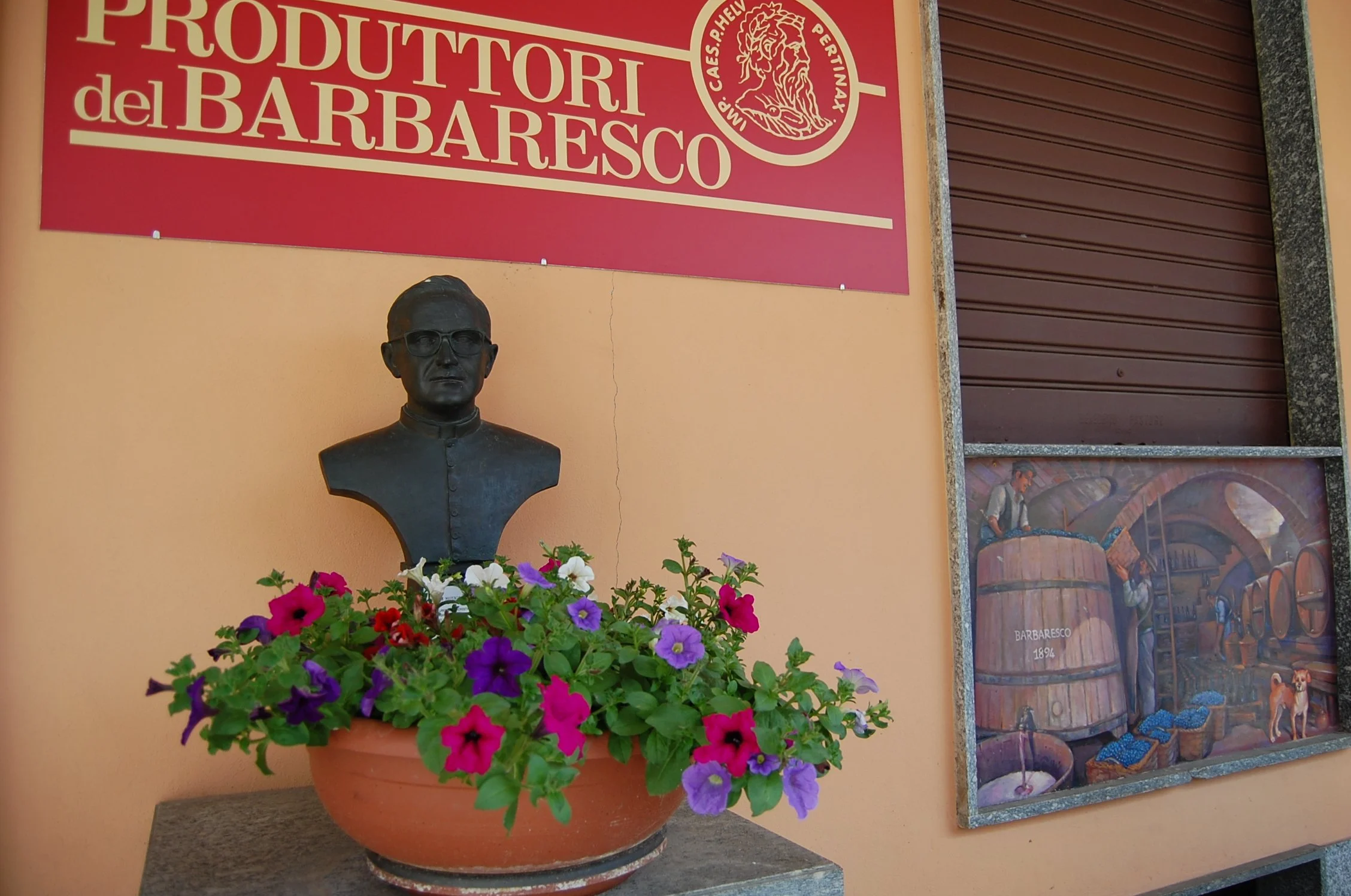 Produttori del Barbaresco har vokst ut av sitt opprinnelige anlegg øverst i landsbyen Barbaresco, og innviet for noen år tilbake et topp moderne vinhus like utenfor byen. Her fra det opprinnelige vinhuset, med byste av grunnleggeren i 1958, prest Don Fiorino Marengo.