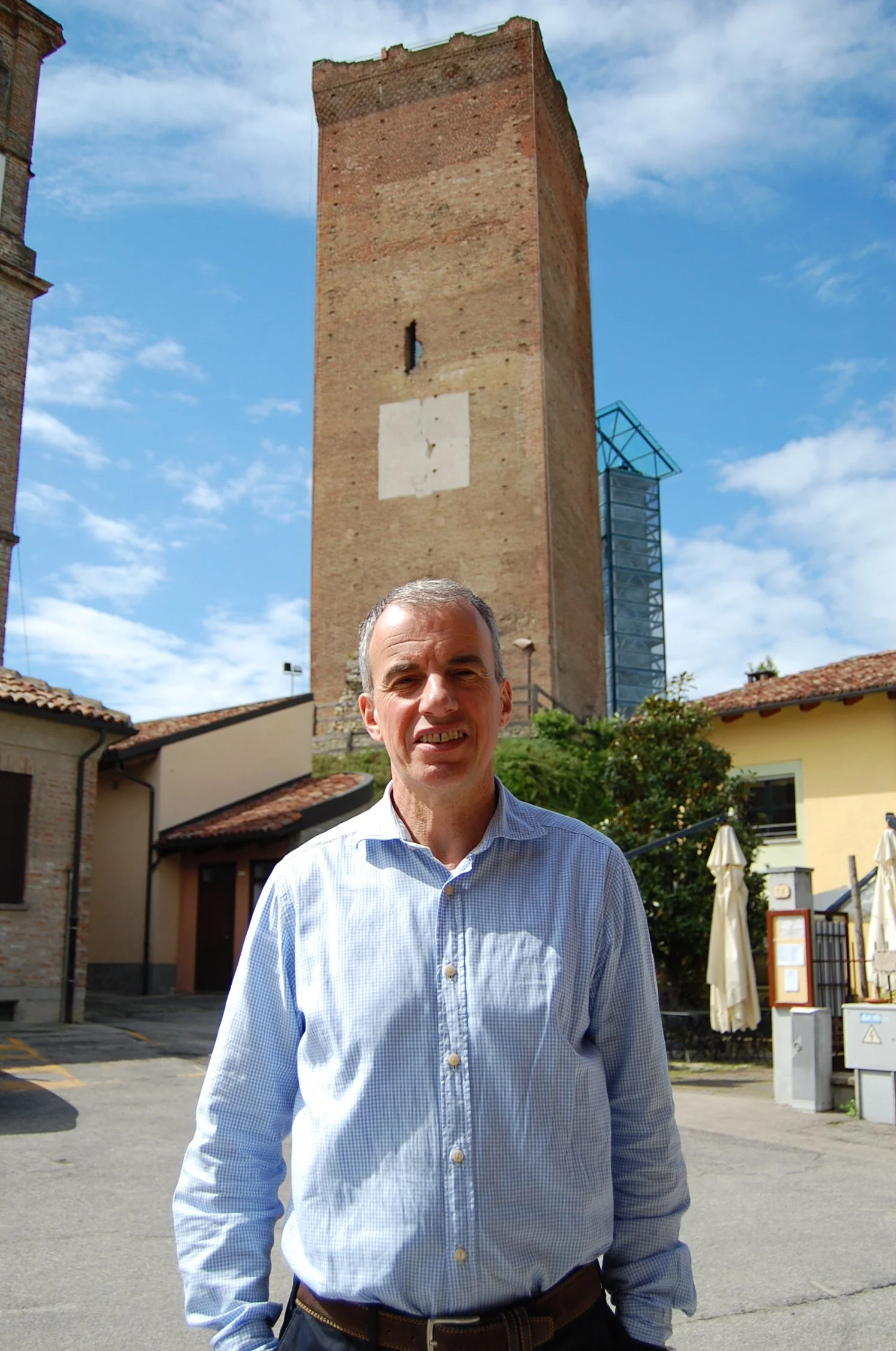 Aldo Vacca fotografert foran ett av de mest kjente landemerkene i Piemonte, tårnet øverst i landsbyen Barbaresco. Herfra har du verdens beste utsikt over landskapet i Langhe.