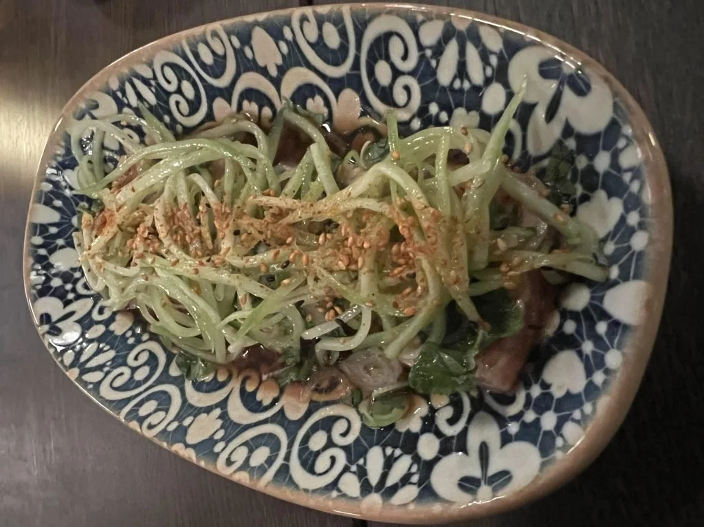 Laksen kom i passende tynne skiver som var varmebehandlet bare på den ene siden, godt kamuflert under masse tynne strimler av agurk, og med mye smak fra de asiatiske ingrediensene. Syrligsøtt og smakfullt, men dessverre tok tilbehøret nuven av de skjøre laksebitene som derfor fremsto litt mer tannløse enn man kunne ønske. Kanskje ville noen saltkorn på fiskebitene løftet smaken noe?