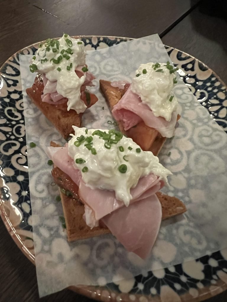 Bruchetta som panert surdeigsbrød med norsk skinke og italiensk ostekrem.