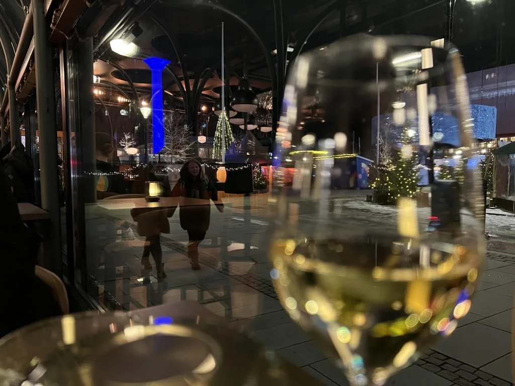 Underveis var vi blitt godt fulgt opp og tatt vare på av en oppmerksom servitør som uoppfordret både tilbød oss en liten pause før hovedrettene, samt å kunne skifte over til et nytt bord i en roligere del av lokalet hvis vi følte at juleborddeltakerne i nærheten ble for høylytte. Vi syntes det var bare trivelig med sang og taler, samtidig som vi kunne nyte utsikten ut til julemarkedet og mye fin vinterbelysning. Så vi valgte å sitte der vi først var henvist.