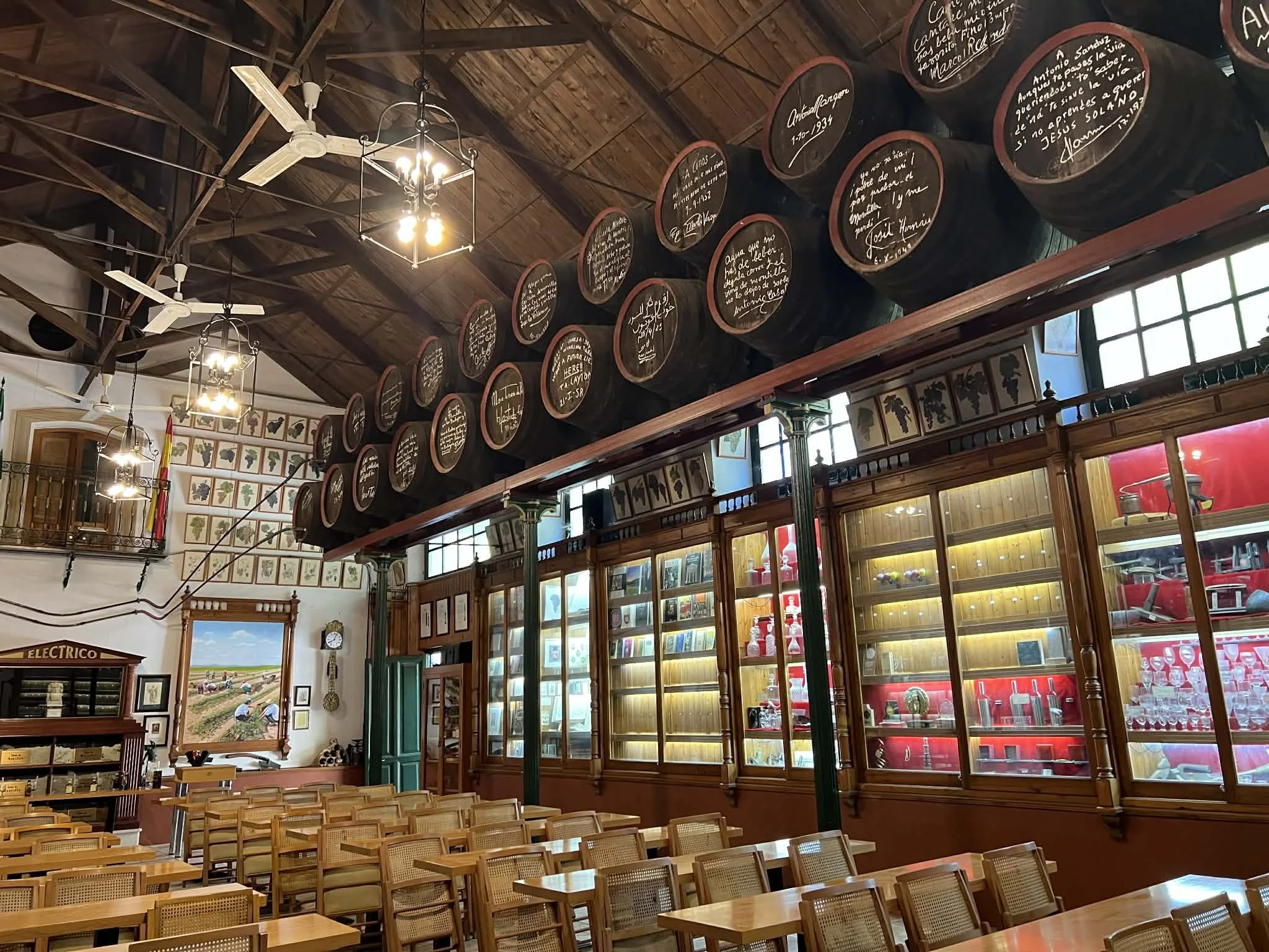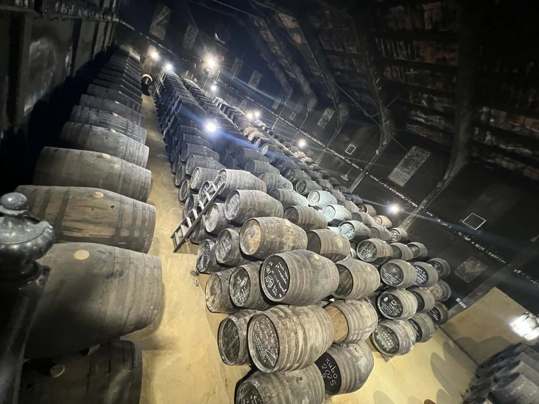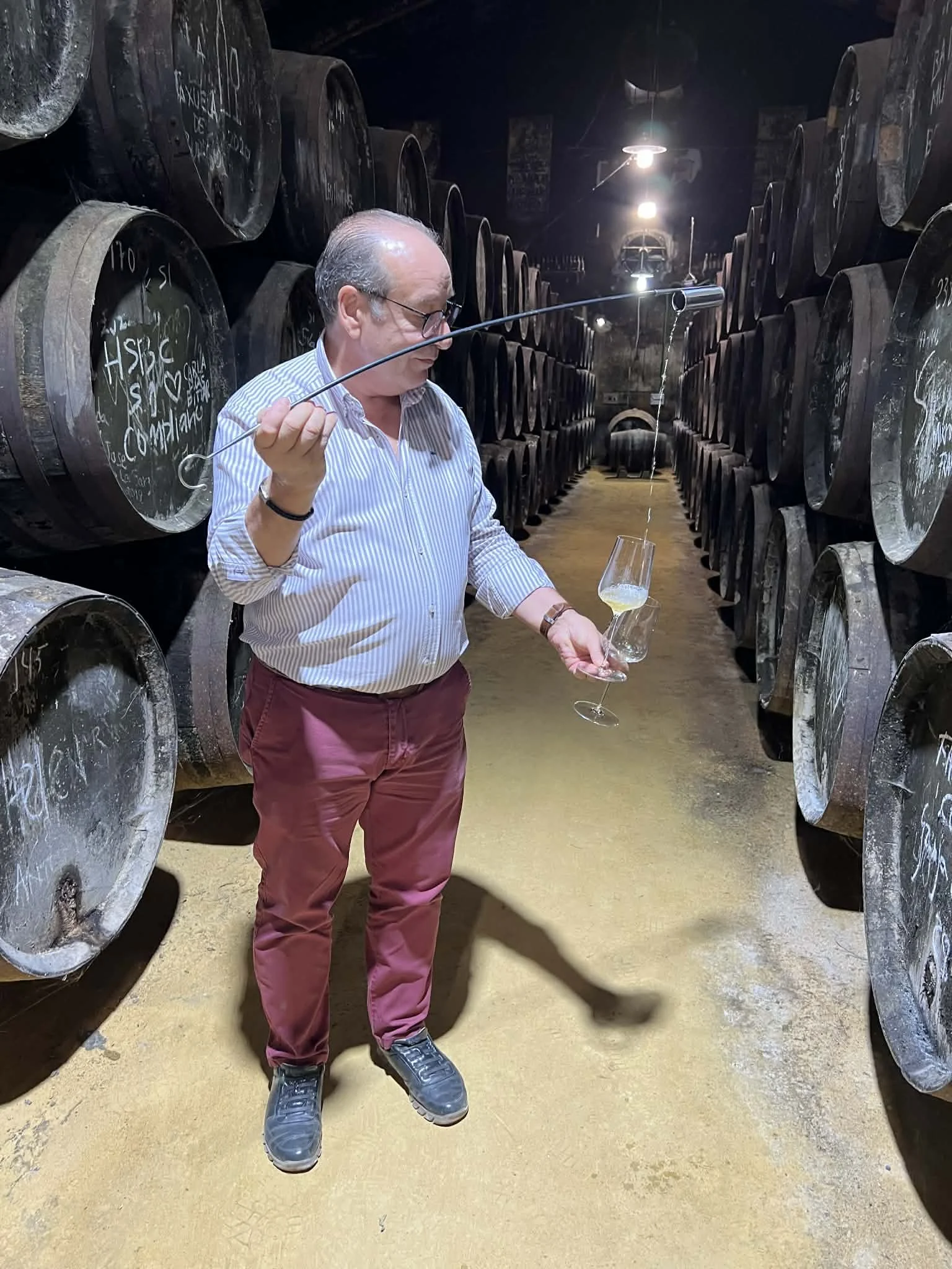 Rart er det å gå inn i kjellere der gulvet er lys, gulaktig albariza-sand. Og du synes det lukter historie fra de litt støvete og godt brukte mørke fatene på 550 og 600 liter som møter oss i de første lagringshallene vi besøker.