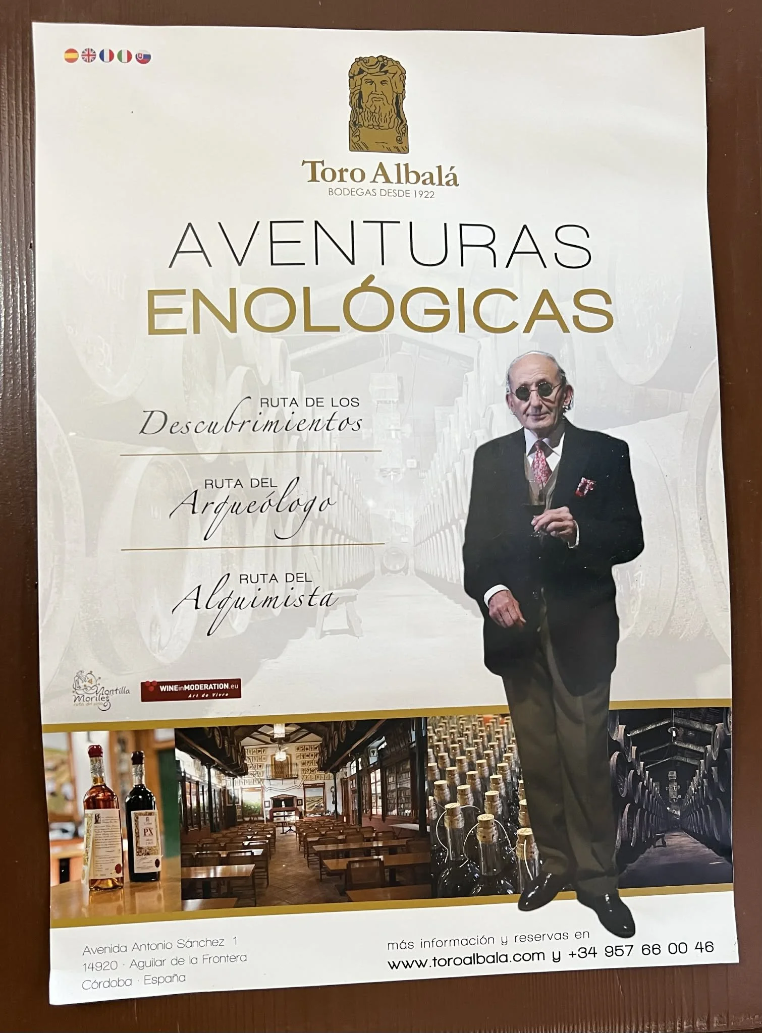 90-årige Antonio Sanchez på en plakat som forteller hva du kan oppleve under et besøk hos Bodegas Toro Albalá. Foto: VinPuls/Ulf Dalheim