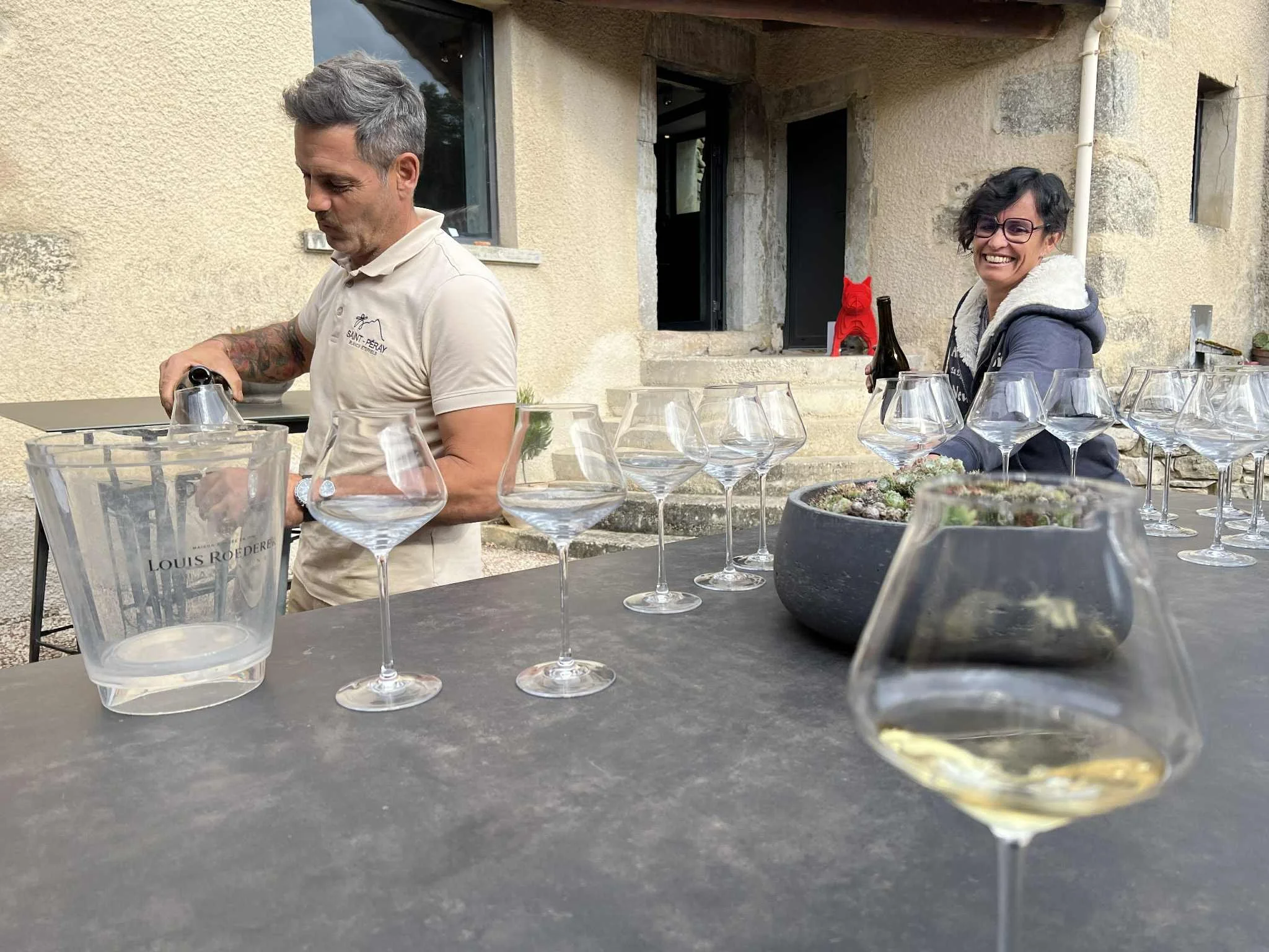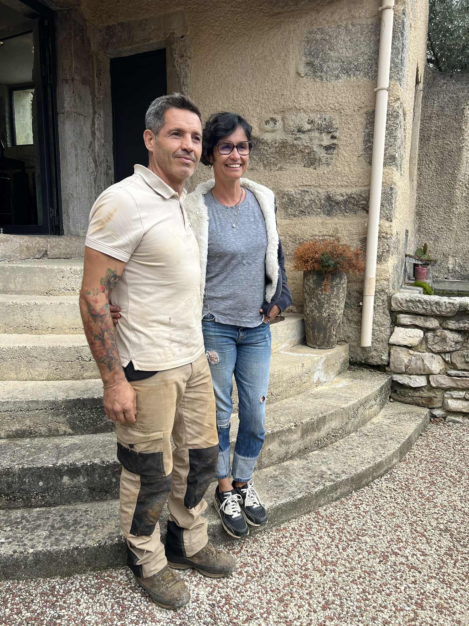 Lite vinhus, men store hjerter. Johan Michell og kona Emmanuelle tok imot besøket fra Norge ute på trappa og hadde smaking på gårdsplassen