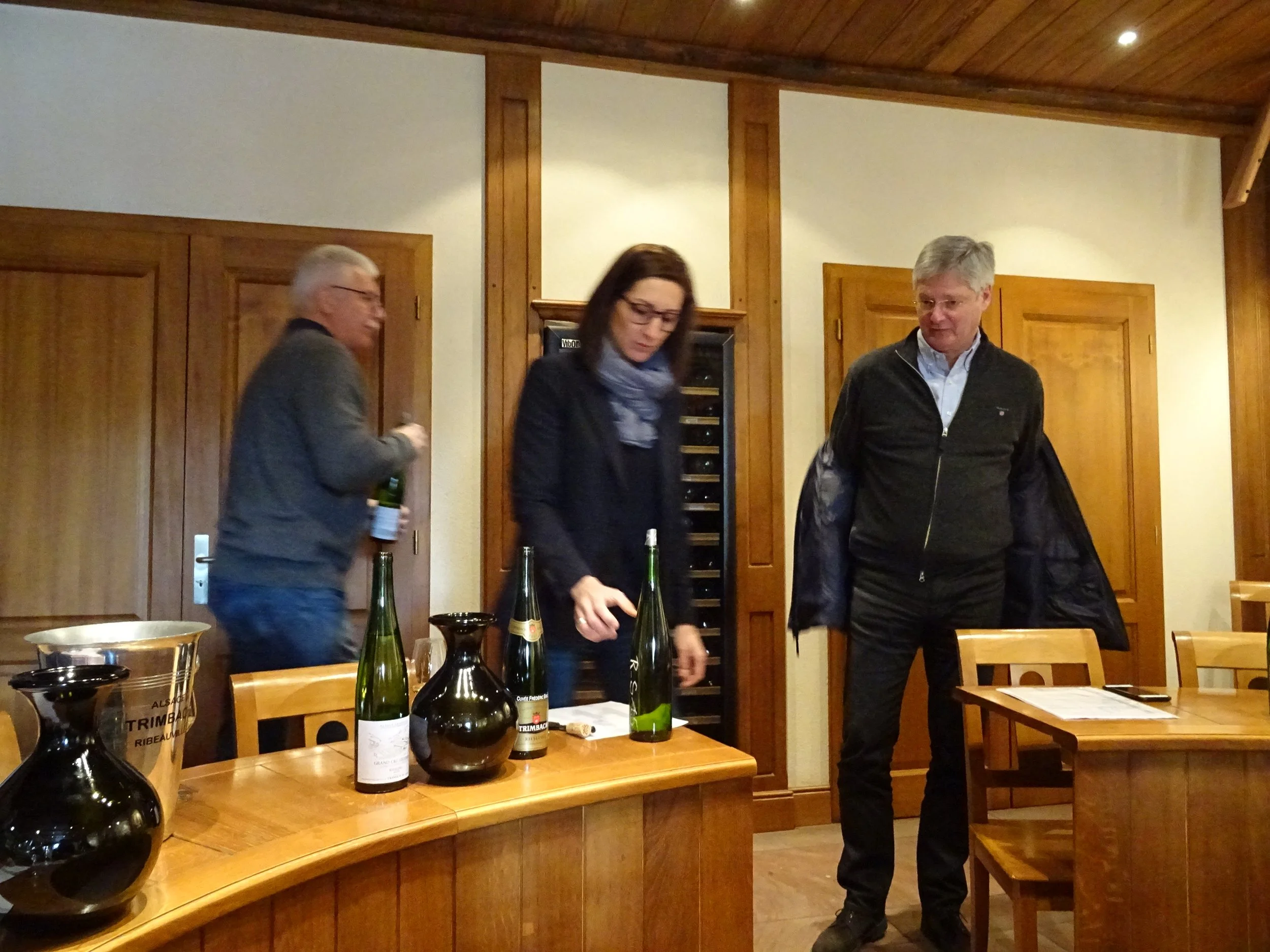 Anne Trimbach sammen med vinmaker Pierre Trimbach (t.v.) og eksportdirektør Jean Trimbach. Foto: VinPuls/Ulf Dalheim