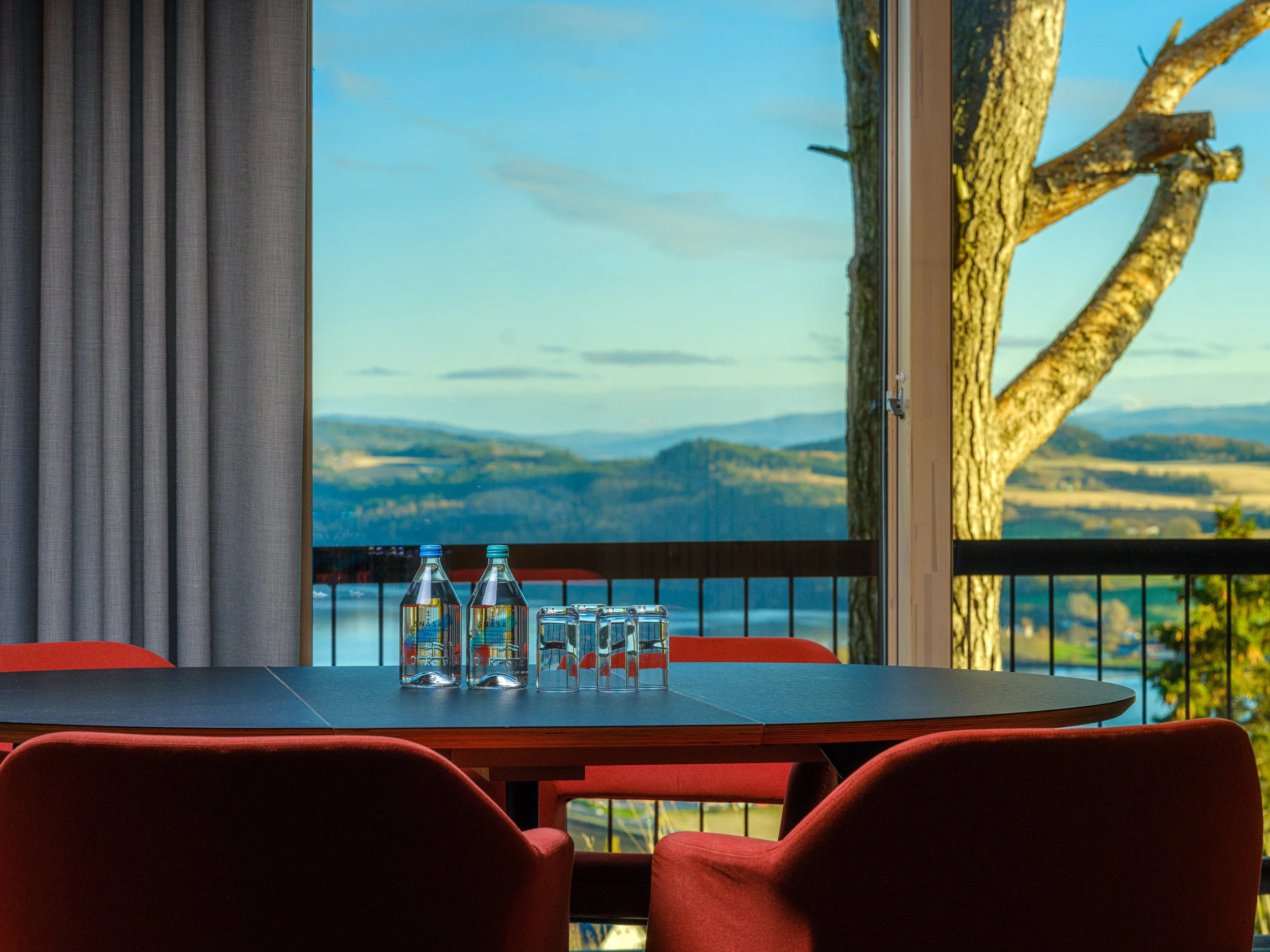 Det prisvinnende bildet viser et konferansebord med vannflasker og glass, plassert foran store vindusflater med utsikt mot det trønderske landskapet utenfor. Komposisjonen skaper en tydelig kobling mellom produktet og naturen det springer ut fra, og formidler ro, renhet og kvalitet.